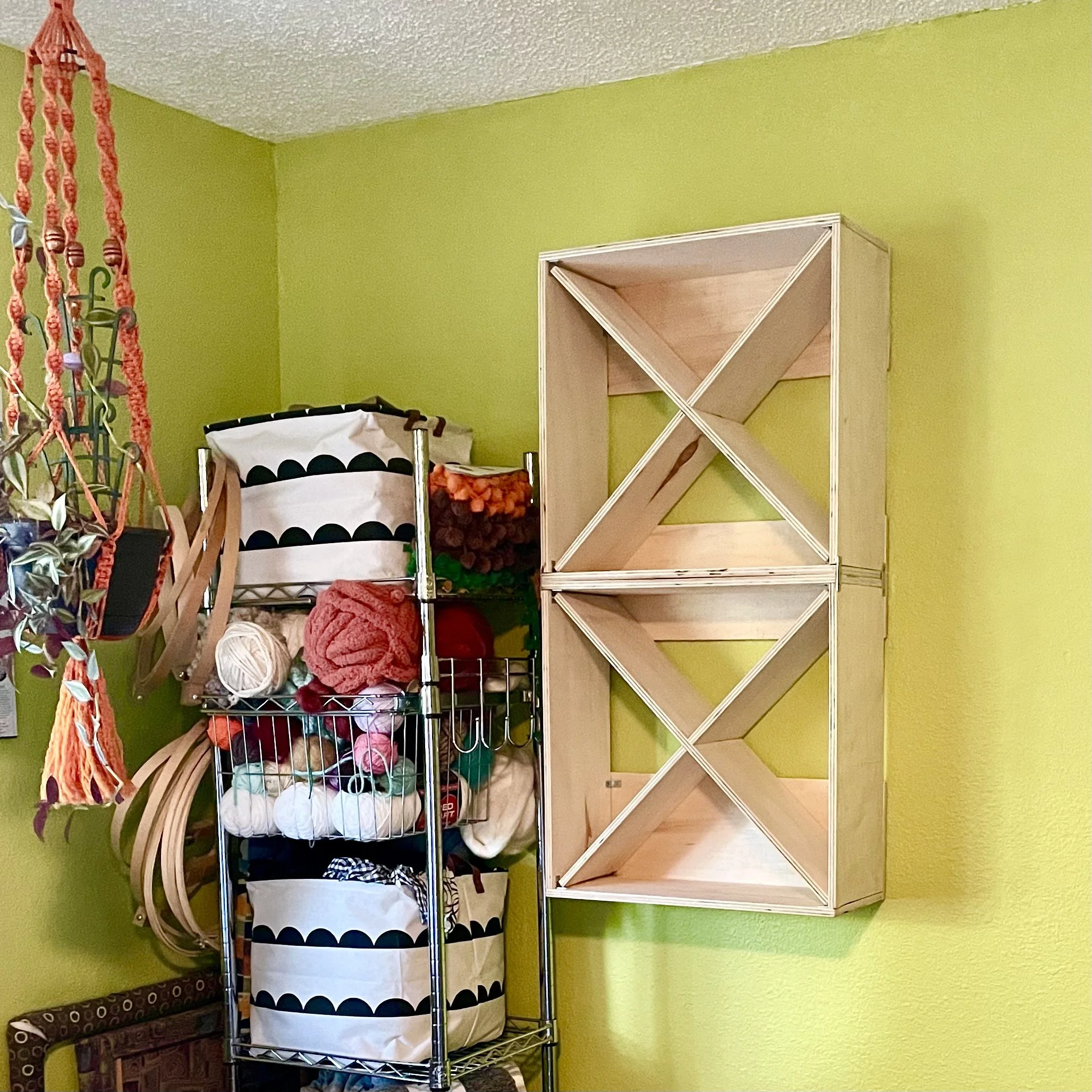 I started doing circular woven wall hangings a few years ago, and as my yarn collection has grown I have grown out of storage space to keep my materials in. I ended up piling all of the yarn in a few different baskets. The baskets were taking up valuable floor space and I was not able to see what I have. I told my wonderful husband what I was envisioning for some wall hung yarn storage boxes and over the weekend he built them for me. I am so thrilled with how they turned out.