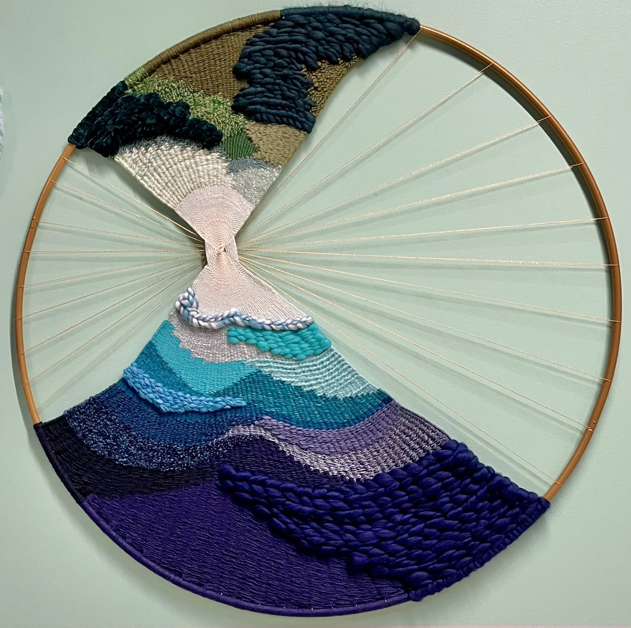 I used a large, gold metal hoop that measures 40” in diameter to create the loom and frame for this weaving. Parts of the hoop and warp strings have been left exposed and it can be hung in multiple positions.
